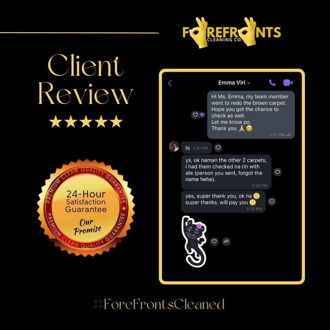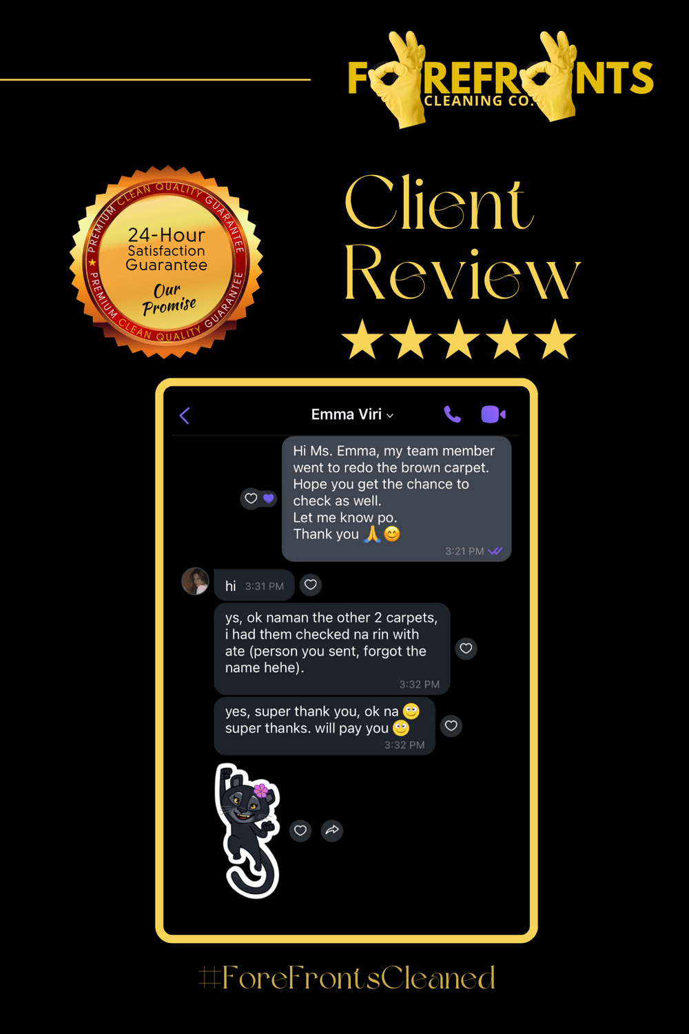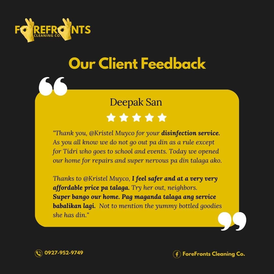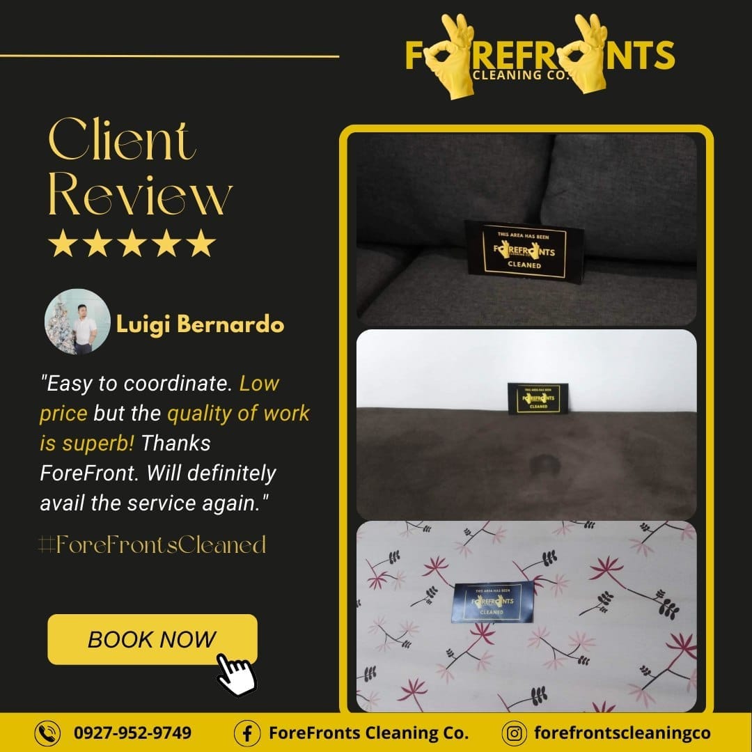 A: Simply click the “Book a Cleaning” button on our website, fill out the form, and choose your preferred time. You can also call 09279529749 or message us directly on Facebook at https://www.facebook.com/forefrontscleaningco.