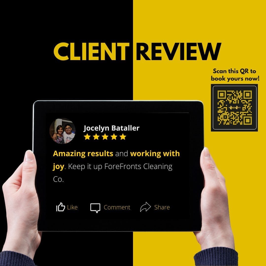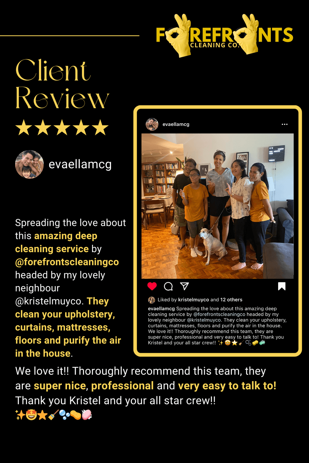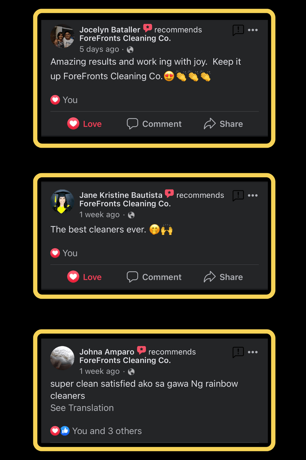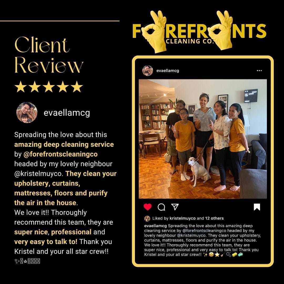A: Simply click the “Book a Cleaning” button on our website, fill out the form, and choose your preferred time. You can also call 09279529749 or message us directly on Facebook at https://www.facebook.com/forefrontscleaningco.